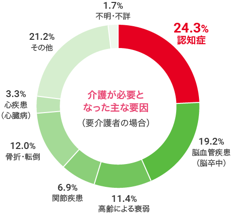 介護が必要になった原因で最も多いのは認知症、また64歳以下でも介護を必要とすることがあります。
