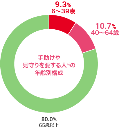 ※「手助けや見守りを要する人」とは、歩行・移動、着替え、洗面、食事、排せつ、入浴等に際してなんらかの手助けや見守りを必要とする人や、意思疎通が困難な人、公的介護保険制度により「要支援」「要介護」の認定を受けている人などをいいます。