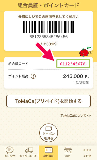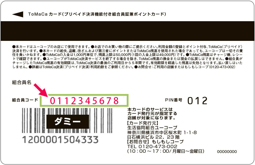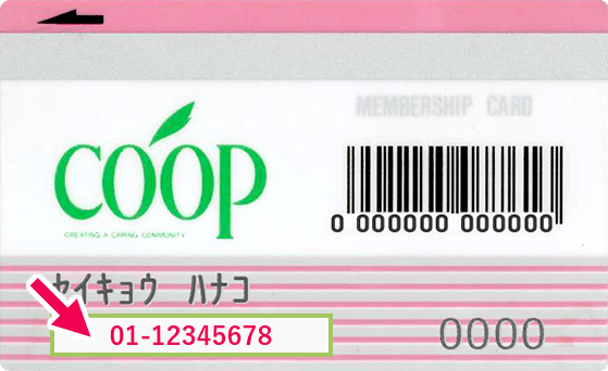 ポイントカード裏面に記載されている 数字10桁が組合員コードです。