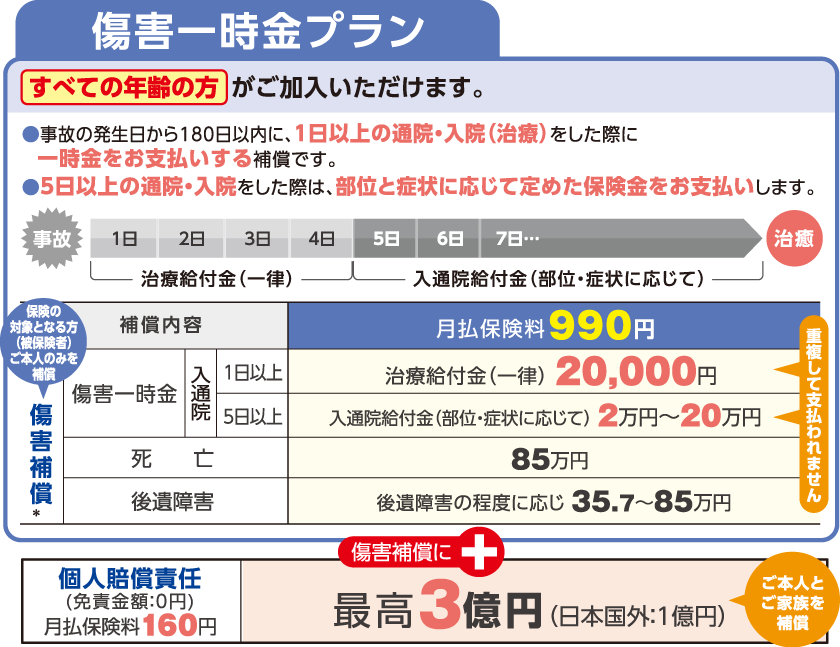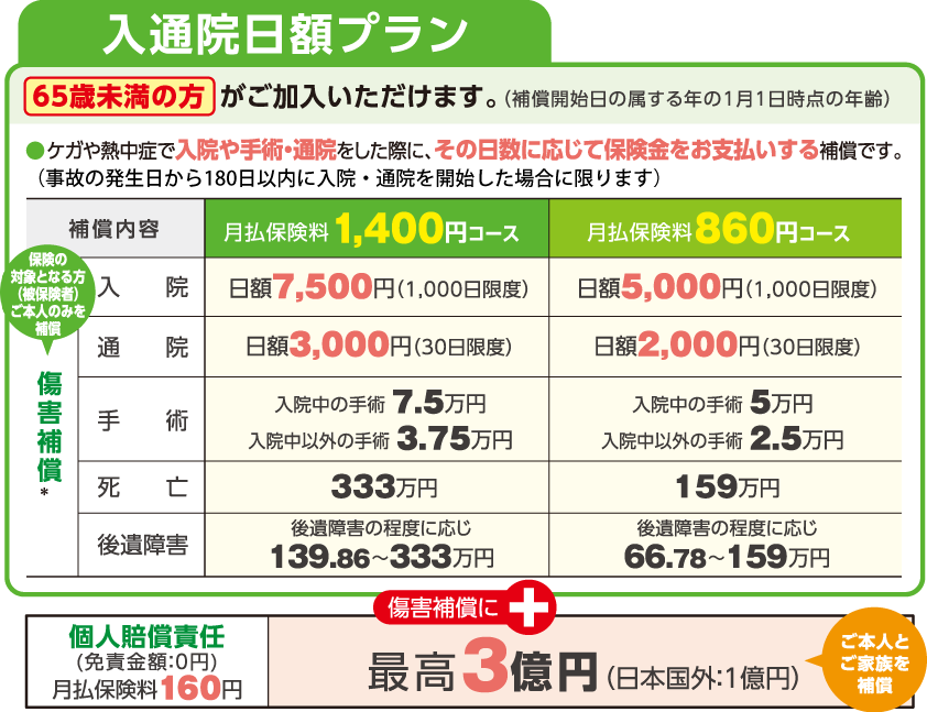 すべての年齢の方が加入できる「傷害一時金プラン」と65歳未満の方が加入できる「入通院日額プラン」からお選びください。