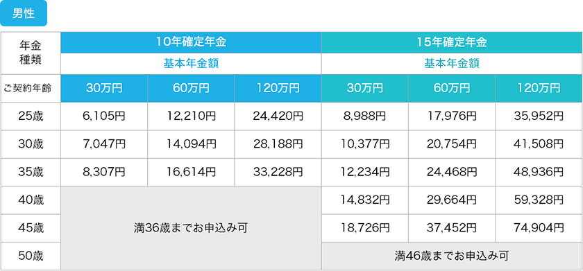 - ・年金の種類が確定年金の場合、年金支払開始日における被保険者の年齢が60歳以上で、かつ、年金支払期間が10年以上であること