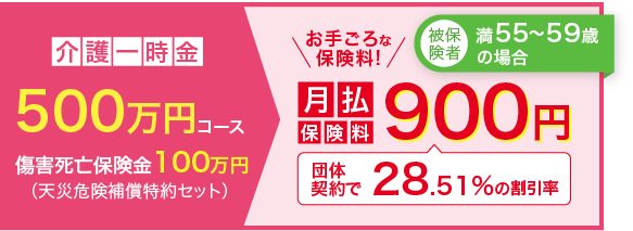 コース被保険者満年齢 月払保険料 月払保険料 月払保険料 月払保険料 月払保険料 新規・継続でご加入できるコース 0〜39歳 90円 80円 70円 60円 50円 40~44歳 160円 130円 90円 80円 60円 45~49歳 330円 250円 170円 130円 90円 50~54歳 610円 450円 290円 210円 130円 55~59歳 1,240円 900円 560円 390円 220円 60~64歳 2,430円 1,750円 1,070円 730円 390円 65~69歳 4,130円 2,960円 1,800円 1,210円 630円 70~74歳 8,720円 6,240円 3,760円 2,520円 1,280円 75~79歳 18,250円 13,050円 7,850円 5,250円 2,650円 継続のみ 80~84歳 - - 15,750円 10,510円 5,280円 85~89歳 - - 29,360円 19,590円 9,820円 介護一時金700万円コース被保険者満年齢 月払保険料 新規・継続でご加入できるコース 0〜39歳 90円 40~44歳 160円 45~49歳 330円 50~54歳 610円 55~59歳 1,240円 60~64歳 2,430円 65~69歳 4,130円 70~74歳 8,720円 75~79歳 18,250円 継続のみ 80~84歳 - 85~89歳 - 介護一時金500万円コース被保険者満年齢 月払保険料 新規・継続でご加入できるコース 0〜39歳 80円 40~44歳 130円 45~49歳 250円 50~54歳 450円 55~59歳 900円 60~64歳 1,750円 65~69歳 2,960円 70~74歳 6,240円 75~79歳 13,050円 継続のみ 80~84歳 - 85~89歳 - 介護一時金300万円コース被保険者満年齢 月払保険料 新規・継続でご加入できるコース 0〜39歳 70円 40~44歳 90円 45~49歳 170円 50~54歳 290円 55~59歳 560円 60~64歳 1,070円 65~69歳 1,800円 70~74歳 3,760円 75~79歳 7,850円 継続のみ 80~84歳 15,750円 85~89歳 29,360円 介護一時金200万円コース被保険者満年齢 月払保険料 新規・継続でご加入できるコース 0〜39歳 60円 40~44歳 80円 45~49歳 130円 50~54歳 210円 55~59歳 390円 60~64歳 730円 65~69歳 1,210円 70~74歳 2,520円 75~79歳 5,250円 継続のみ 80~84歳 10,510円 85~89歳 19,590円 介護一時金100万円コース被保険者満年齢 月払保険料 新規・継続でご加入できるコース 0〜39歳 50円 40~44歳 60円 45~49歳 90円 50~54歳 130円 55~59歳 220円 60~64歳 390円 65~69歳 630円 70~74歳 1,280円 75~79歳 2,650円 継続のみ 80~84歳 5,280円 85~89歳 9,820円