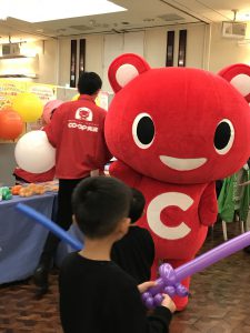 みんなの人気者コーすけでおなじみCO-OP共済、おうちCO-OPや夕食宅配、健康管理食のご案内、お子様向け「食DE健康」クイズなど生協ユーコープからも多数出展がありました。
