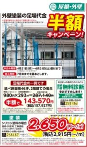 足場代半額キャンペーン受付中!!申込は4/21(月)~6/21(土)まで! 作業は7月末まで!
