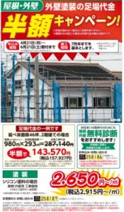外壁塗装の足場代半額キャンペーン受付中!!申込は4/21(月)~6/21(土)まで! 作業は7月末まで!