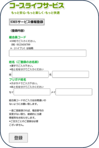 ⑤WEBサイトに組合員コード、氏名(漢字とカタカナ)を入力し、最後に「登録」ボタンをおします。