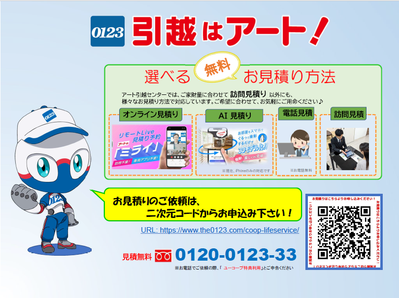 ※お申込みの際、必ず「ユーコープ特典利用」とご申告ください。受付時間 9:00~19:00(年末年始を除き年中無休) 【ご注意】 1.アート引越センターが同時期に実施する他のキャンペーンとの重複利用は出来ません。また、お見積後のお申し出には対応できませんので、ご了承ください。 2.ユーコープ特典除外期間:3月15日~4月10日のお引越しは、引越基本料金10%割引となります。 3.引越基本料金=人件費+車輛費 4.組合員特典はお電話もしくは専用URLでのお申込みに限ります。アート引越センターHPからのお申込みは「組合員特典の対象外」となります。 |