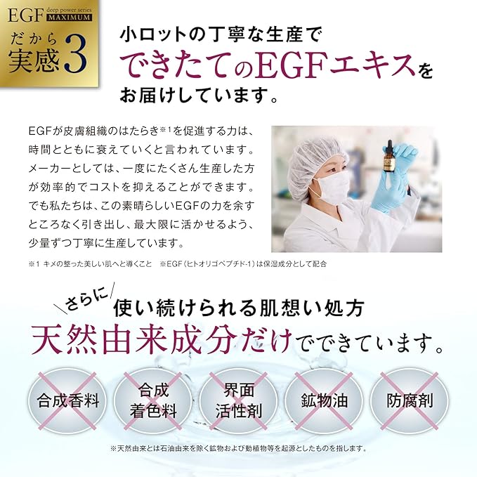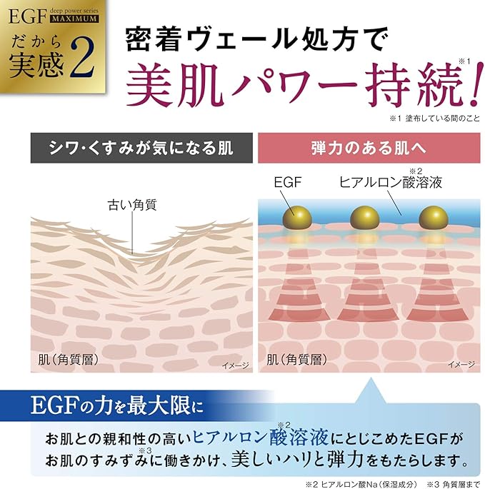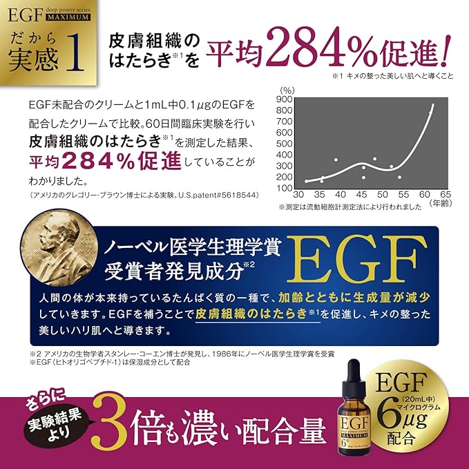 EGFディープパワーエキス マキシマムには、なんと約3倍の6μgのEGFを配合しています。