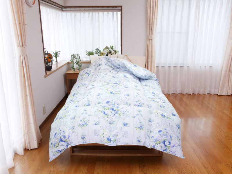 ・生地はふんわり軽い綿ポリエステル混合生地(ふんわりと軽いので中の羽毛がつぶれにくく、60サテンの側生地よりシングルで200g~300g軽くなります。軽いものがお好きな方へおすすめです。
