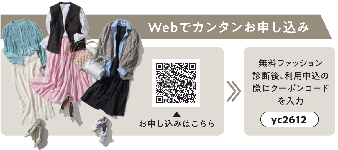 QRコードからお申し込み ▶無料ファッション診断後、利用申込の際にクーポンコード「yc2612」を入力 ▶ お洋服3着お届け・着用 ▶ 感想と次回リクエストをWebで入力▶コンビニや自宅で返却(返送料330円)