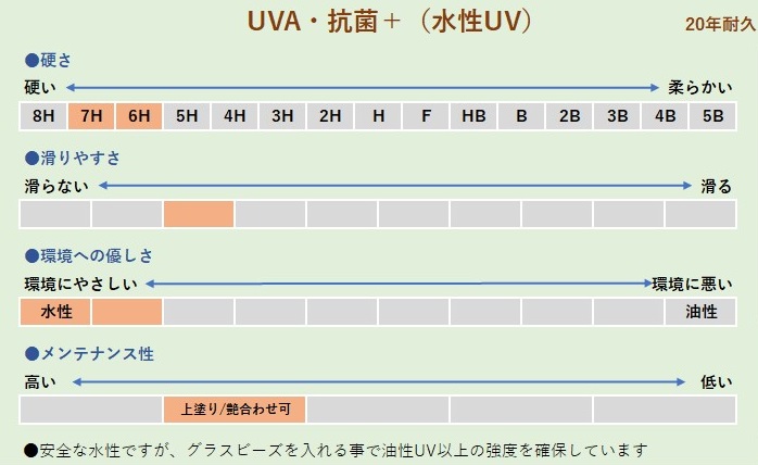 「UVA・抗菌+」は画期的なUVコーティング剤で環境に安全な水性でありながら一般的なUVに劣らない強度を有し、さらにグラスビーズを加えることでガラスコーティングと同等な硬さと耐久性を発揮します。