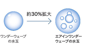流速の違う洗浄水を交互に噴出することで水玉を連射するワンダーウェーブ洗浄。その水玉に空気を含ませることで、たっぷり感のある洗浄を実現しました。少ない洗浄水でも快適な洗い心地が特長です。(おしり洗浄のみ)