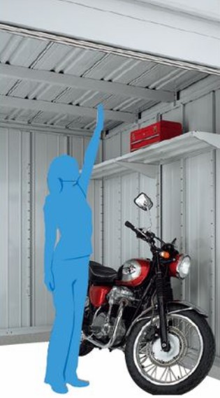 整備もできるよう充分な高さを確保しました。物置メーカーの保管庫だから収納力の高い棚も自慢です。