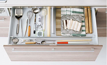 フォローパレット(扉連動式)よく使う調理道具などがワンアクションで取り出せます。調理小物やレードル、カトラリーなど、よく使うものを収納するフォローパレット(内引き出し)が扉と連動して引き出せるので調理がもっとしやすくなりました。