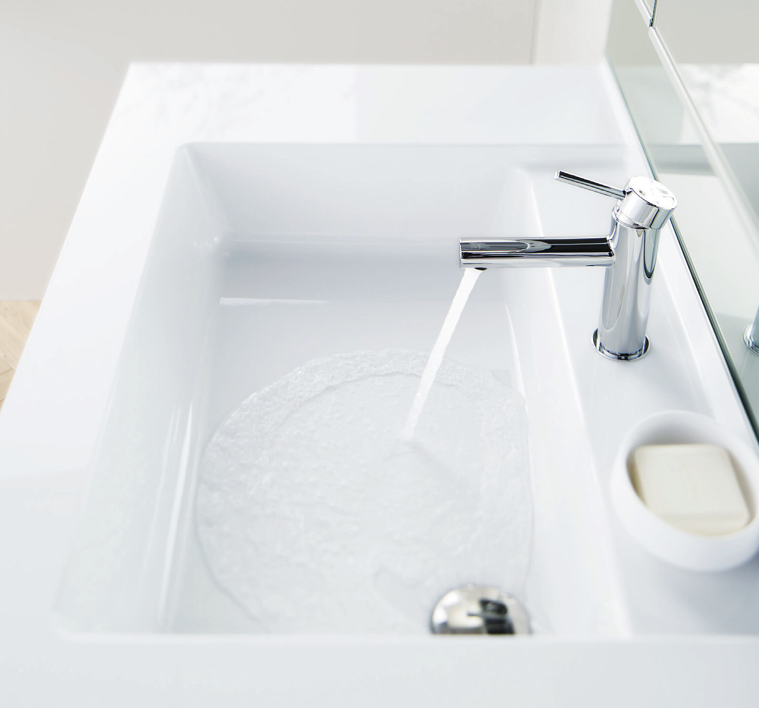 お掃除しやすいボウルや排水口で、まいにちキレイに。 身支度も家事もテキパキはかどる、使いやすい機能が充実した洗面化粧台です。