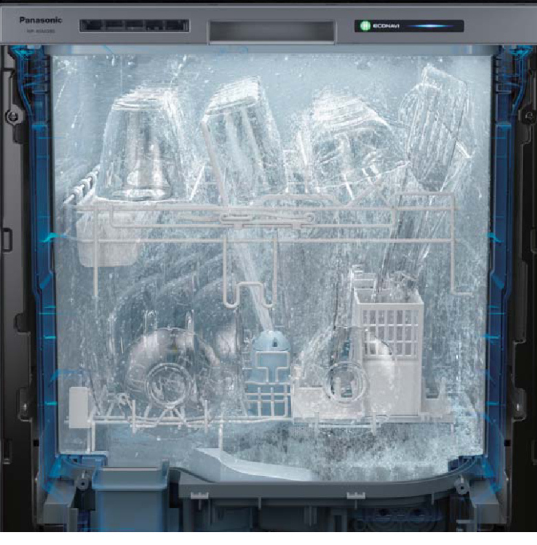 ゆっくりとヘラのように汚れを押し上げ、そぎ取る集中高圧水流 自転しながら、勢いよく連続噴射高密度水流 だから、庫内全体に水流がいき渡る。2つの水流の合わせ技で、ガンコな汚れを根こそぎ退治。