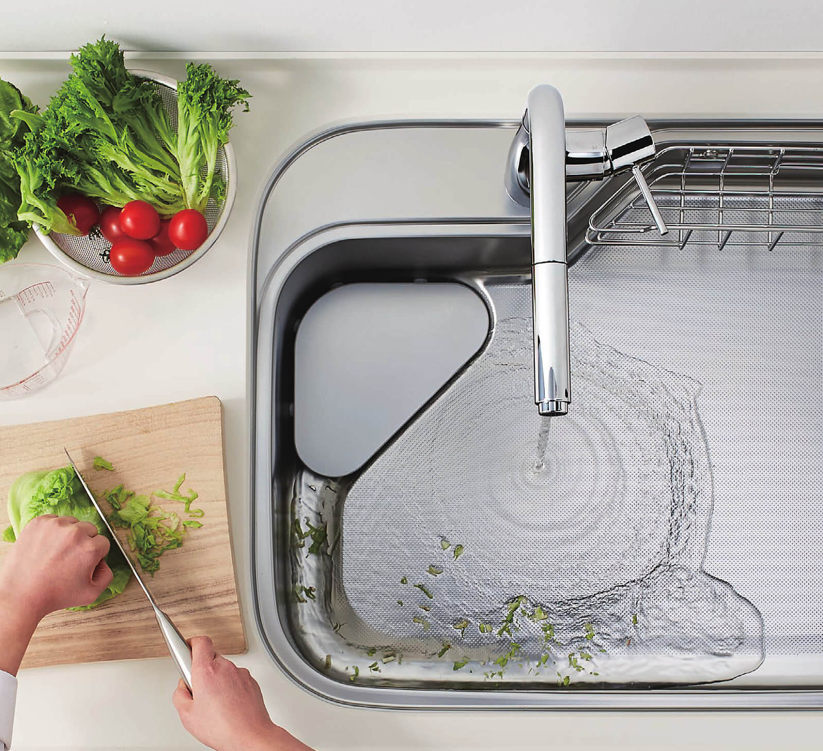 新発想の「流レール」が生みだす水流。お料理中などに使う水が、ゴミや汚れを手前の「流レール」に集めながら流れます。「流レール」に入ったゴミは水流に押されて排水口に集まる仕組み。調理中からシンクをキレイに保つ主婦思いの機能です。