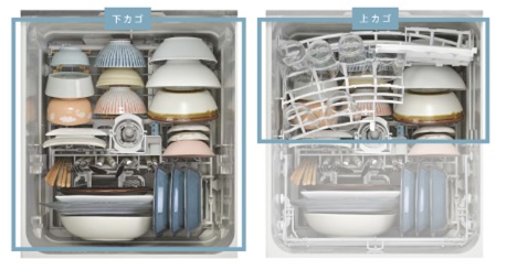下カゴは、広めのピッチのピンを備えた可動式レールを左右に動かせるので、形や大きさの違う食器もまとめてセットしやすい。また、上カゴのラックを折りたためば、料理に使った調理器具もまとめて洗うことができます。