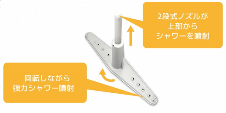 水圧で伸びる2段式ノズルを採用。下部ノズルからのシャワーに加え、上部からシャワーを拡散することで、庫内のスミズミまで水流が届きます。上カゴや大皿の上部の汚れもムラなく洗い流します。