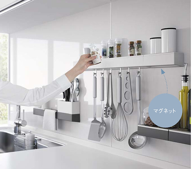 タカラのキッチンは、ホーロー素材だから、お好きな場所にペタッとマグネットが貼れます。壁に穴をあけずに、位置も自由に変えられるので自分好みの収納がつくれて満足出来ます。