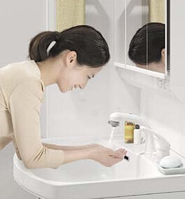 ゆったり広いボウルなので、洗顔や洗髪をしても周囲に水ハネが飛び散りにくく、床やキャビネット前面を水濡れからガード。