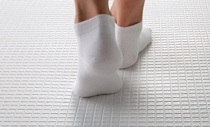 すべりやすくなる原因は、足の裏と床の間にできた水膜。カラリ床は、水を床の溝から逃がして水膜ができるのを防ぐ構造ですべりにくいので安心です。
