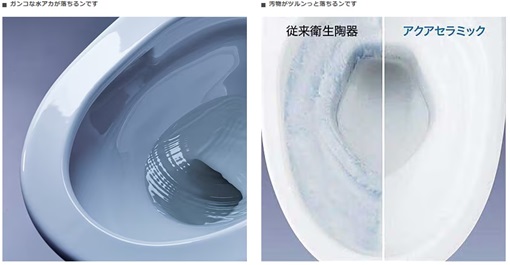 新品の時の白さ・輝きが100年※1つづく新素材。簡単なお掃除でずっとキレイがつづきます。従来の衛生陶器ではできなかった「がんこな水あか」も「汚物」もどちらも落とせる、お掃除ラクラクな衛生陶器です。