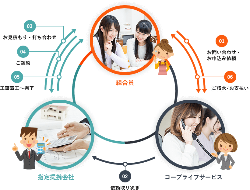 株式会社コープライフサービスは、組合員の皆様に対し指定提携会社をご紹介いたしますが、当該指定提携会社との工事に関するご契約につきましては、組合員の皆様ご自身のご判断のもと、締結していただいております。