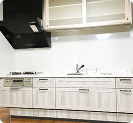 水栓の漏水がきっかけで、キッチンリフォームを検討されていました。身長にあったワークトップの高さが選べることがお気に召されたため、システムキッチンを施工いたしました。シースルーのお洒落な吊り戸と、レンジフード、調理機器は既設のままですが、ホワイトオークのパネルが映える美しいキッチンが完成しました。