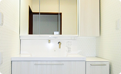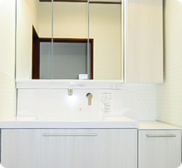 三面鏡が付いて収納力が高い洗面台。鏡裏や配管部分、けこみなどのスペースを工夫して収納スペースに。出し入れしやすい引き出しなどバリエーション豊富なキャビネットを品揃えしています。お客様の声S様