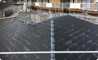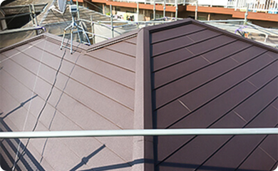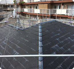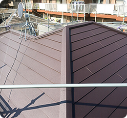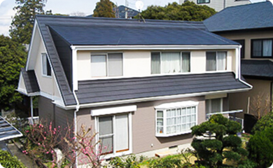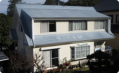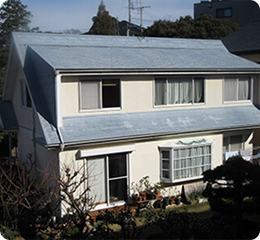 定期的に塗装が必要な寄棟形状のスレート屋根の上に、メンテナンス期間が格段に伸びるガルバリューム鋼板を重ね葺きました。スレートと遮熱性鋼板は同じ薄型屋根材であり、建物の洋風イメージを損なうことはありません。