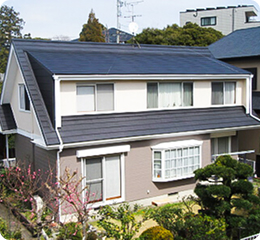 スレート上にガルバリューム鋼板屋根材の重ね葺と外壁塗装で見違えるようになりました。外壁を2トーンカラーに塗り替えた色と屋根のブラックがとても相性良く、住む方のセンスを感じさせる建物に蘇りました。