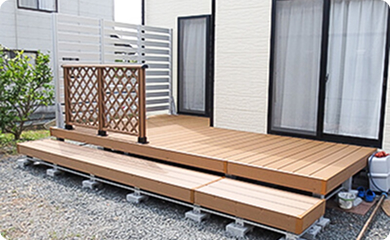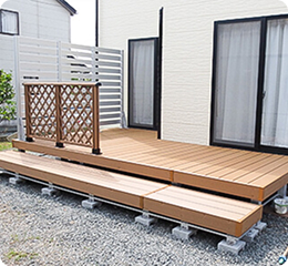 ウッドデッキはリビングなどの部屋から直接外に出られるように設置することが多く、内と外を一体化して空間に広がりを持たせることができます。人気のウッドデッキですが、1~2年に1回程度は塗装が必要になるためメンテナンスが大変でした。そのため、腐らない樹脂木材のウッドデッキにしましたので、長く使っていただけると思います。