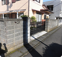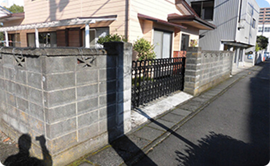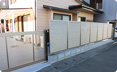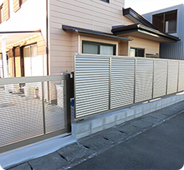 開閉が楽になる電動引き戸門扉がある駐車場。6段積みのブロック塀に囲まれた外柵及び駐車場を、目隠しと通風機能を合わせ持つフェンスに、手動門扉を電動門扉にリフォームしました。駐車場は排水を考慮したコンクリート仕上げです。