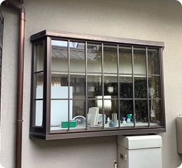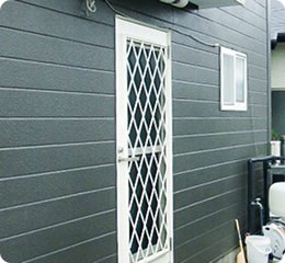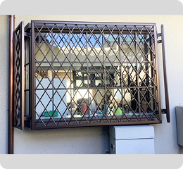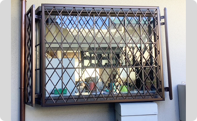 防犯対策として、ヒシ格子(*)設置しました。侵入者が「侵入が難しそうだ」という視覚的な抑止力と、窓ガラスを割っても簡単に侵入できないので諦めさせる効果があります。また、強風時に飛んでくる物が窓ガラスに当たるのを防ぐ効果もあります。