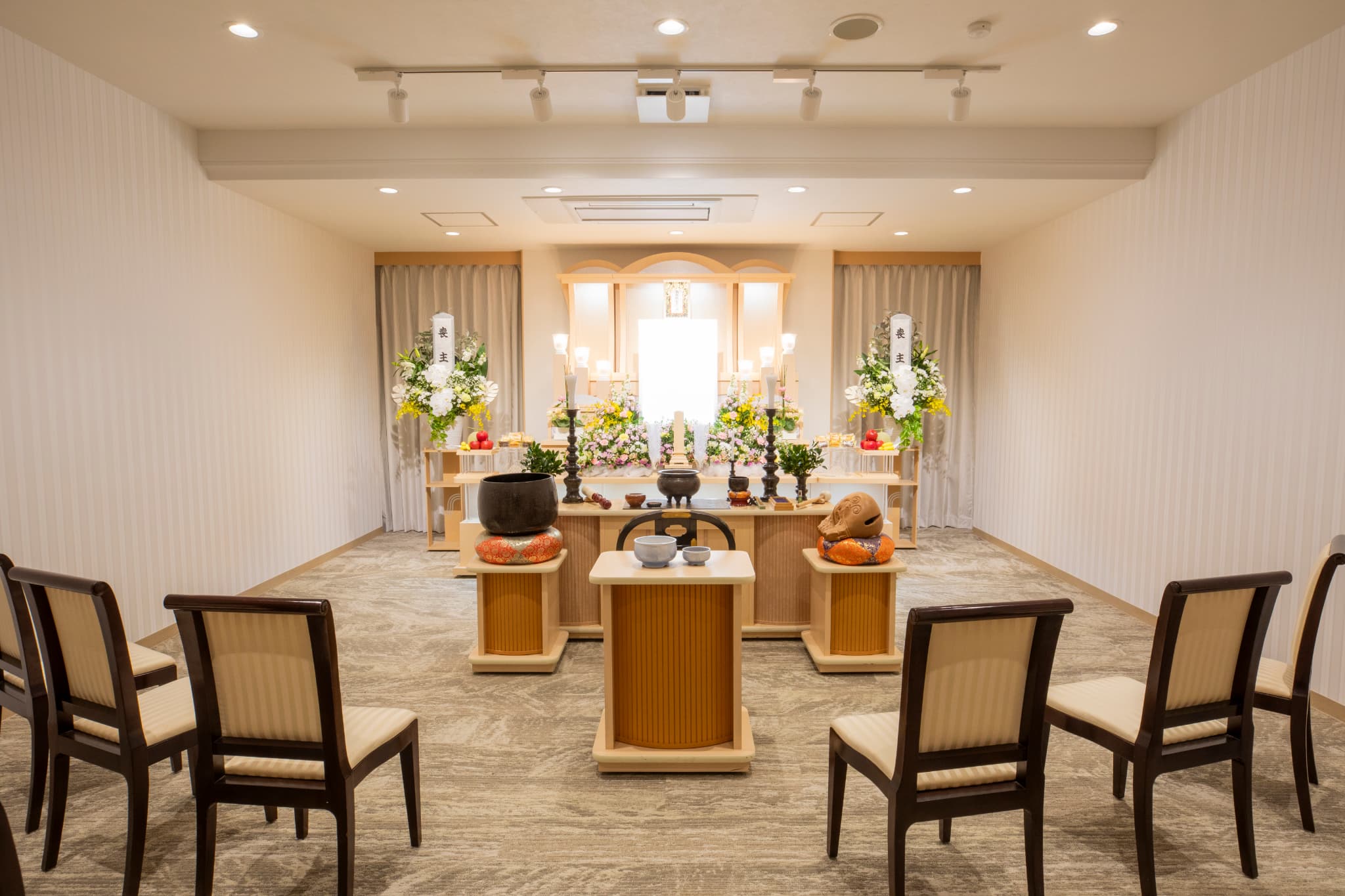 ◆リビングホール(~30名)家族葬 ◆白デザイン祭壇 ◆式場と控室がワンフロアー(宿泊可) |