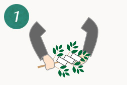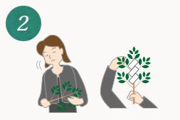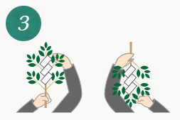 玉串の葉先がご神前に向くように持った後、根本がご神前に向くように右回りに半回転させた状態で奉ります。