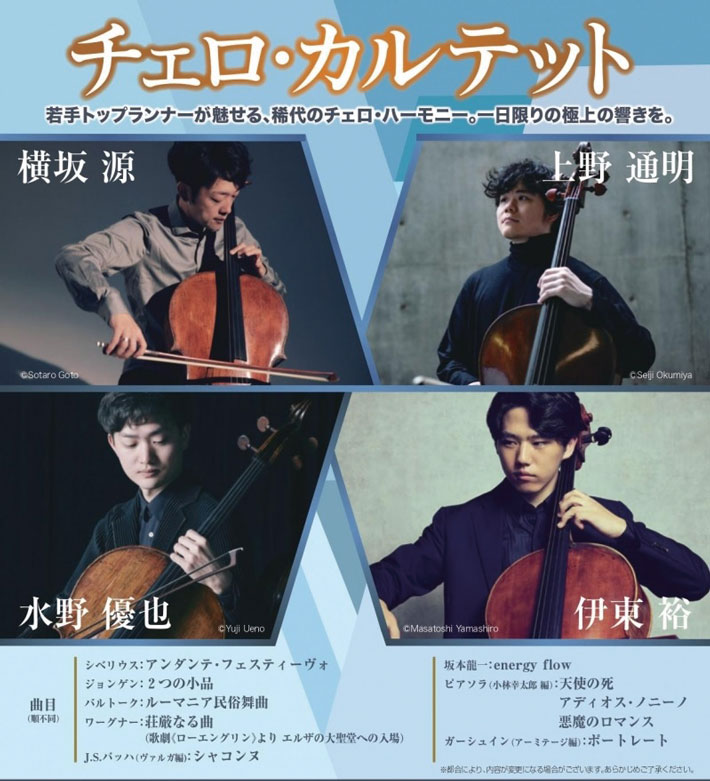 浜松と縁の深いチェリスト・横坂源が、2024年にNHK交響楽団グランシップ公演にも出演した上野通明ら若手チェリストを率いて一日限りのカルテットを結成。